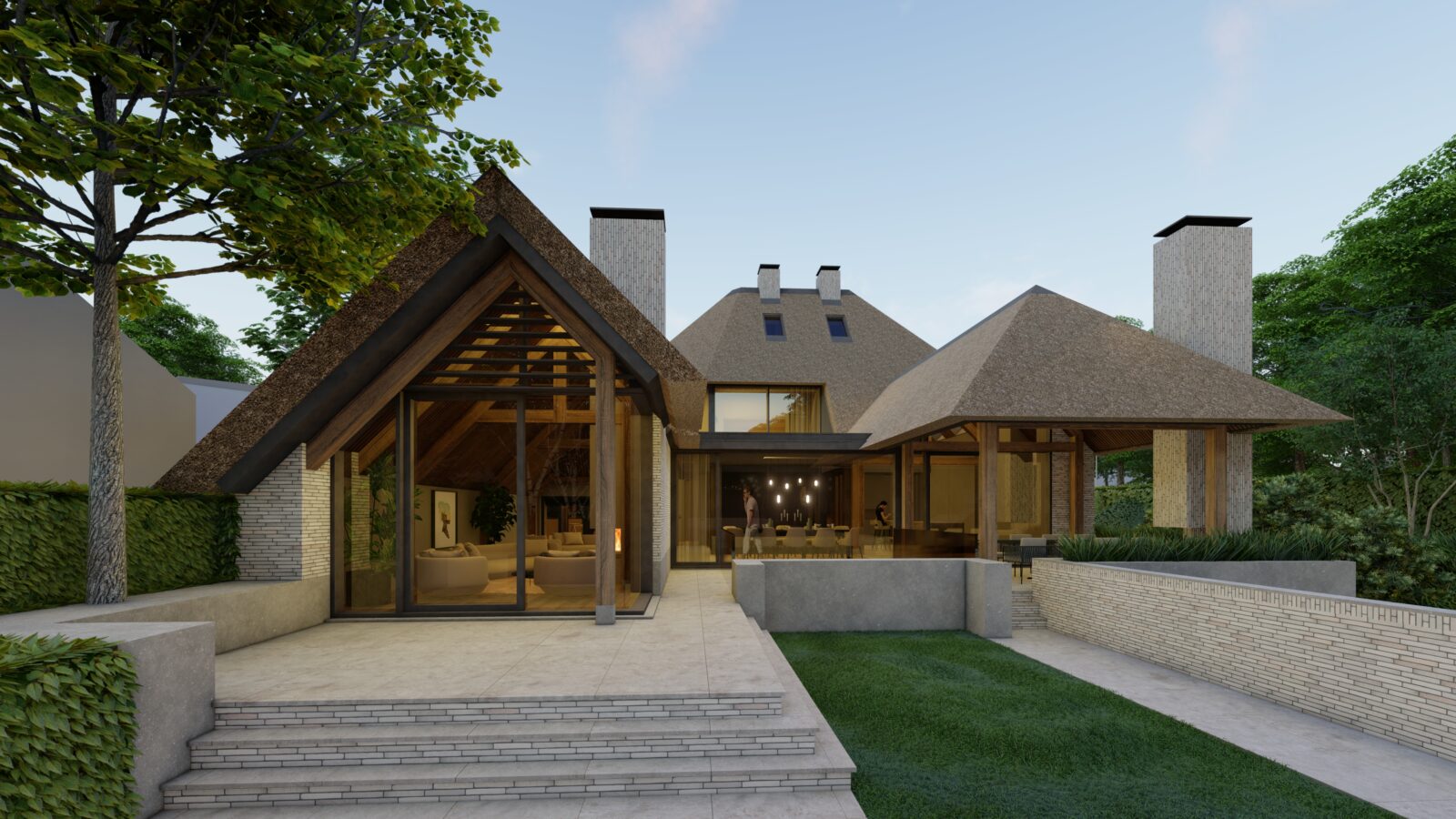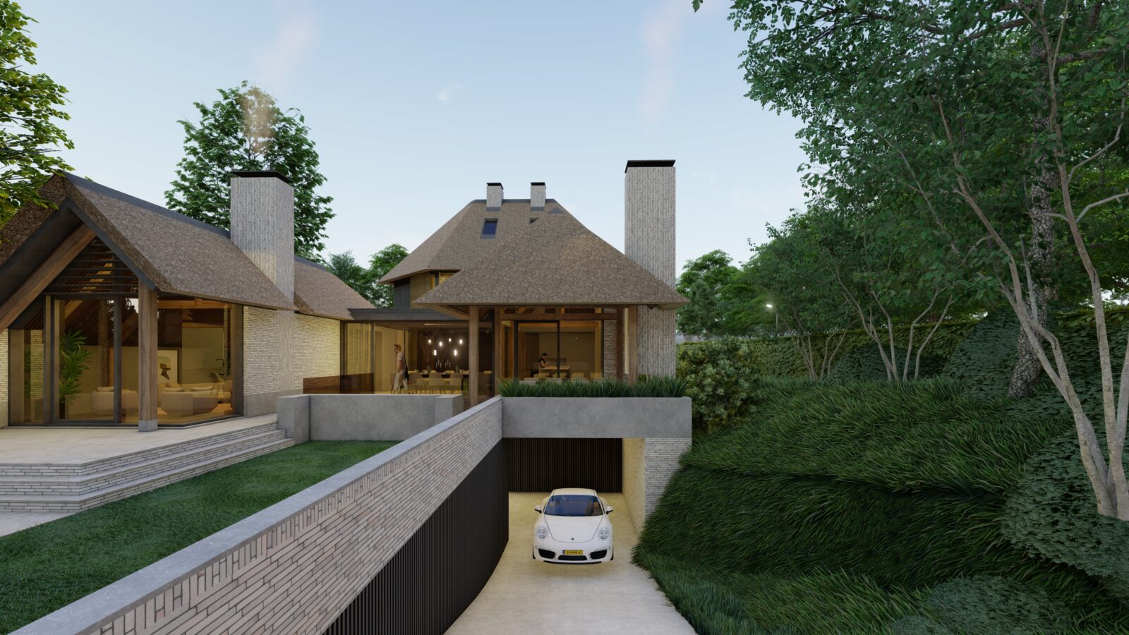 Materialen: Petersen gevelstenen, Reynaers aluminium kozijnen, rieten kap, Basalte Domotica